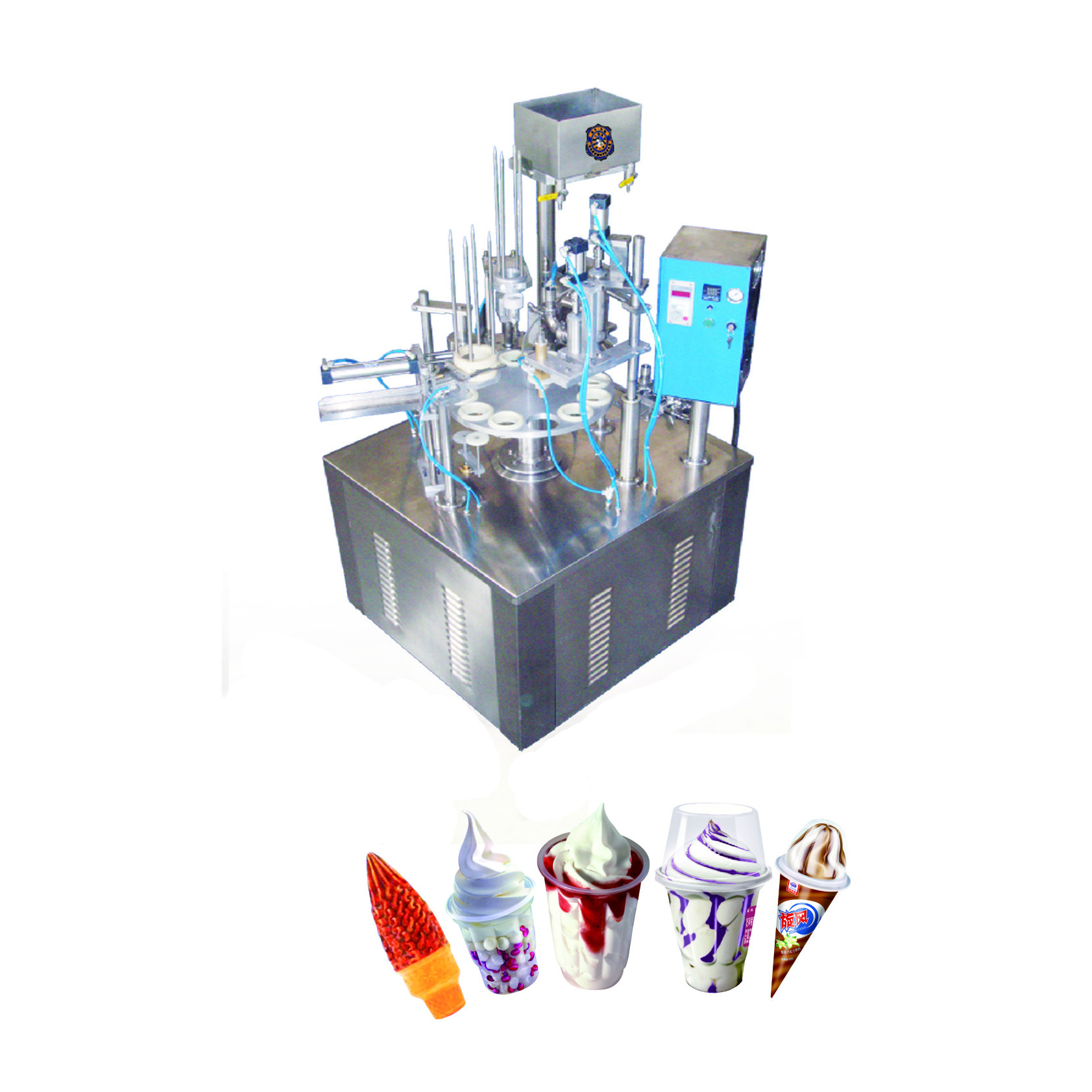 Family ice cream filling machine runs in an intermittent linear manner, with two heads filling and bottling soft ice cream simultaneously. The machine can mainly be used to manufacture big family cup ice cream, combining a wide range of functions such as cup discharging(by hand), filling, flower topping, jam charging, and products pushing out(by hand).